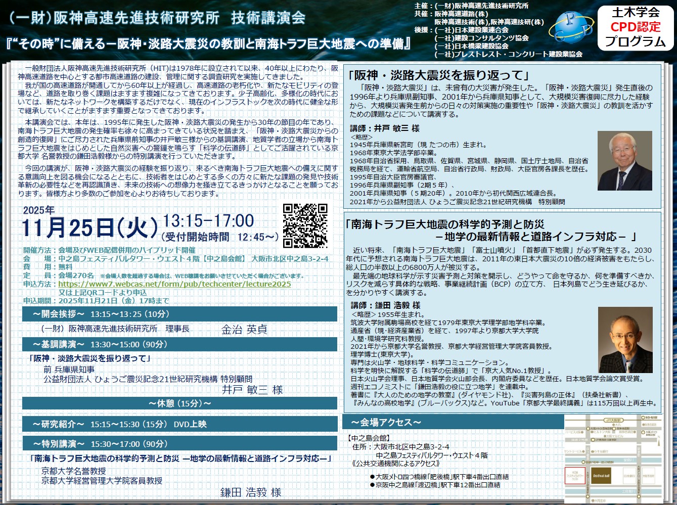 「”その時”に備える-阪神・淡路大震災の教訓と南海トラフ巨大地震への準備」をテーマとした技術講演会を11月25日(火)に開催いたします。